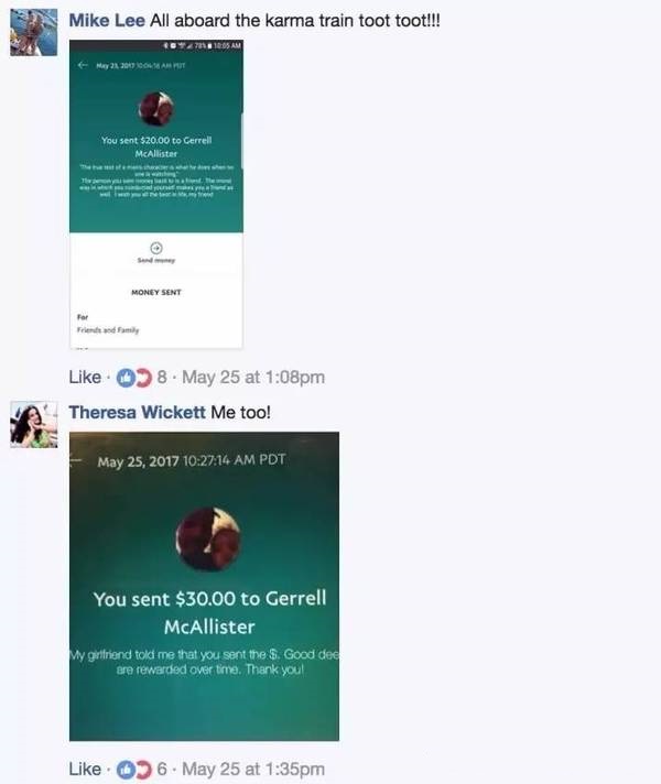 ▼Mellissa將這件事放上臉書之後,網友紛紛詢問Gerrell的帳號號碼,許多熱心網友紛紛向他的Paypal戶口轉賬,讓Gerrell大受感動。
