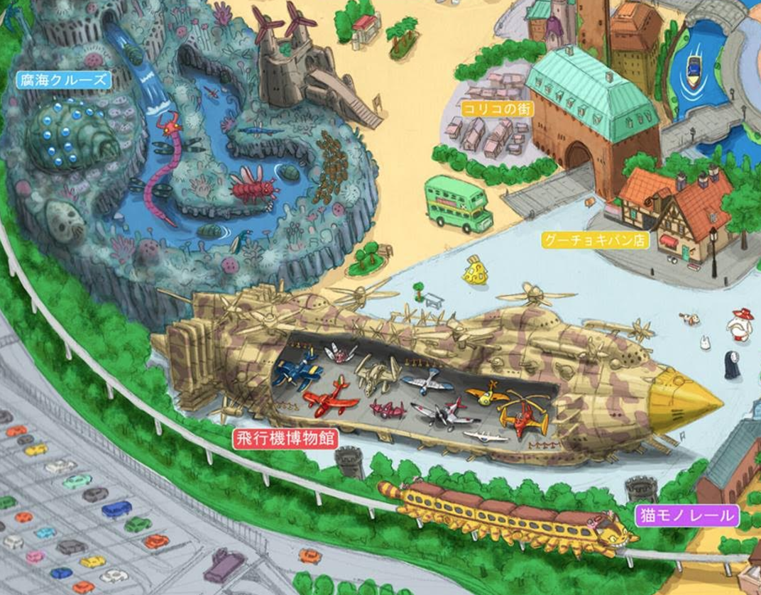 ▼我們可以看到畫中不僅有《風之谷》中的腐海飛車,還有飛機博物館,更有龍貓造型的遊覽車,簡直酷炫!