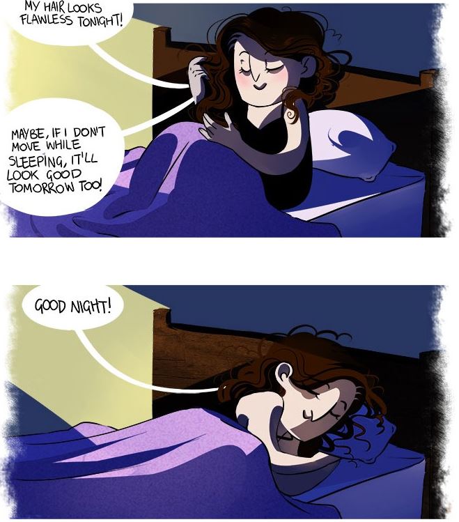 ▼2. 「我今晚的頭髮看起來實在太完美了!」、「也許,只要我睡覺保持不動,它明天依然能這麼閃閃動人。」、「晚安囉!」