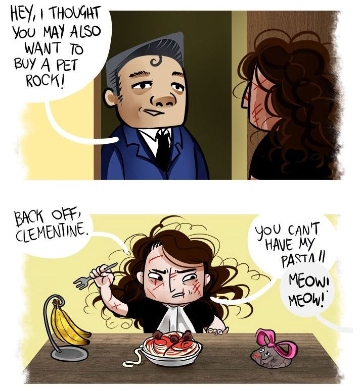 (回到餐桌)「嘿,橘子(寵物石名)走開,你不能吃我的義大利麵…」