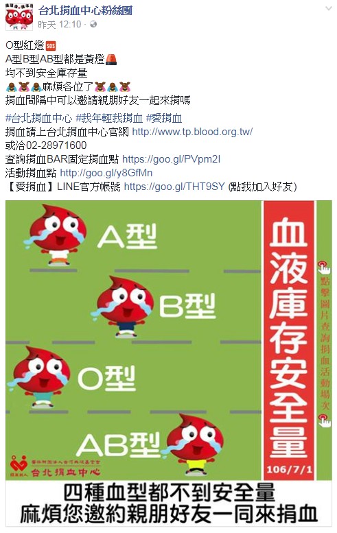 2017年07月02日大家踴躍來捐血!台北捐血中心粉絲團在7月1日公布了最新的庫存量,其中O型血已經亮紅燈,庫存嚴重不足只夠3.2天的份量!而A型、B型、AB型都不到安全庫存量,創下3年來的新低。