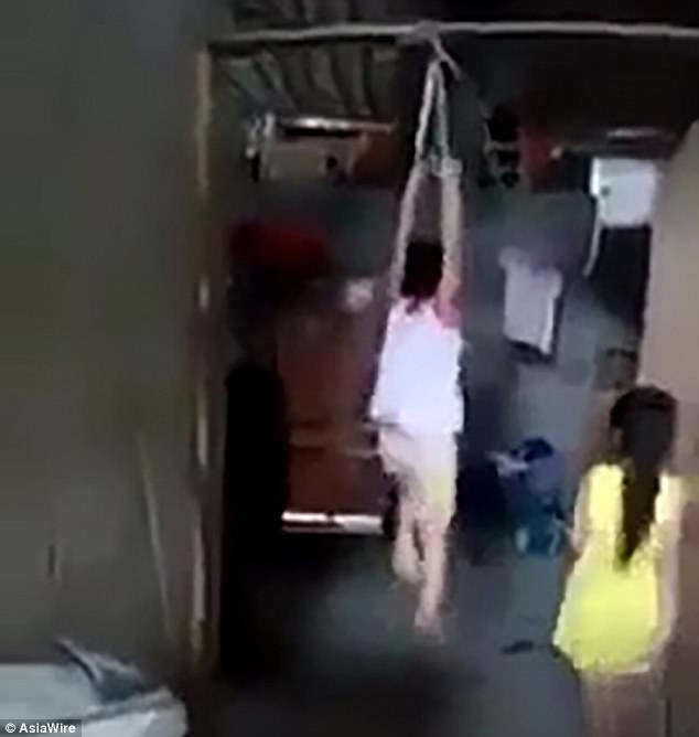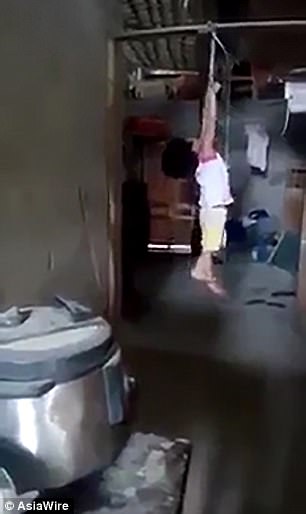 ▼那天小女孩偷了一罐牛奶,Phuong發現後勃然大怒,直接用麻繩綁住她的手,將她吊掛在天花板上。小女孩腳不能碰到地,不斷發出慘叫。