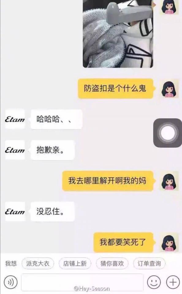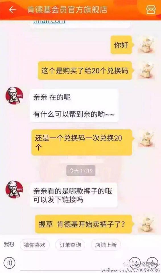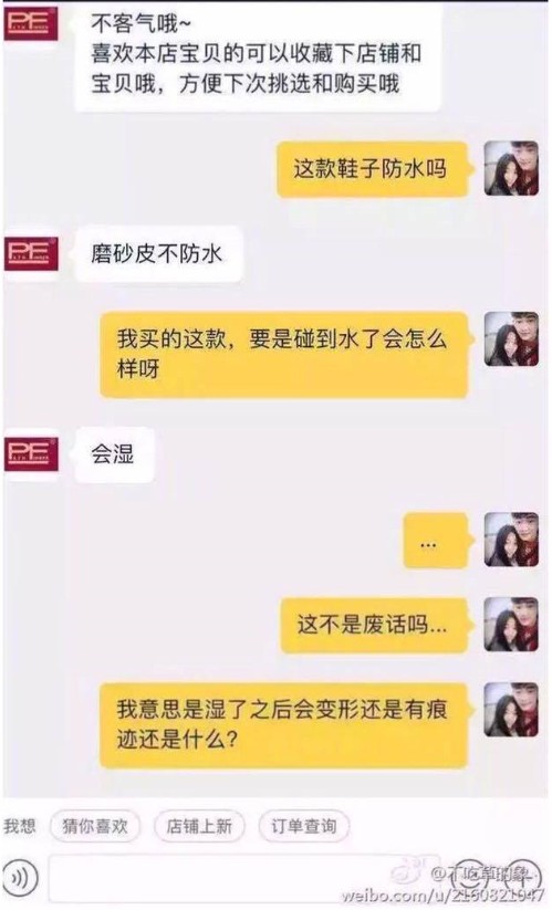 2017年07月06日常在網路上買東西的大家,一定都會有跟賣家客服交流的經驗,這些網拍客服有些是店主自己兼任,也有一些是另外聘請來的員工。中國的網路經濟十分蓬勃,擁有數不盡的賣家就一定也有數不盡的客服,人多質素就一定會參差不齊,詢問他們問題時有時候會得到一些讓人啼笑皆非的回覆,來看看他們是怎麼回覆的吧: