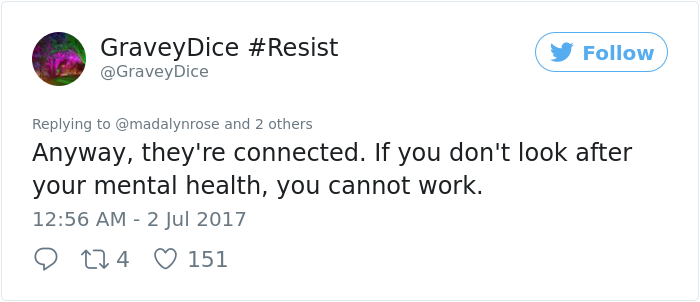 ▼「這兩者是相關的。如果你有心理健康方面的問題,你也無法好好工作。」