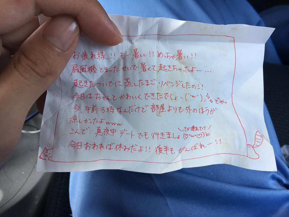 2017年07月17日提起日本夫妻,很多人首先想到的就是「愛妻便當」。妻子每天早上都會為丈夫準備便當,這也是他們增進感情的好方式。下面這名日本網友到公司工作時,看到了太太偷偷塞在便當裡的小紙條,上面的內容超甜蜜的。