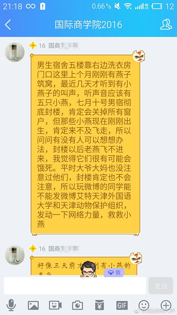 ▼住在這棟樓中的男生表示,他們6月份的時候看到燕子過來築巢,7月初才聽到小燕子的叫聲。現在小燕子還很小,但學校馬上就要封樓了,如果不想想辦法,小燕子會很可憐。他們將這件事PO到微博上,希望學校和當地的動保組織幫幫這些小傢伙。