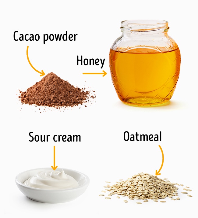 ▼祛痘敏感肌膚面膜。把3勺燕麥磨碎,把1/3杯可可粉和1/4杯蜂蜜加入2勺奶油混合。所有材料充分混合後,塗抹在臉上保持15~20分鐘洗淨。這款面膜針對油性、粉刺、衰老、乾燥和敏感肌膚很有療效。