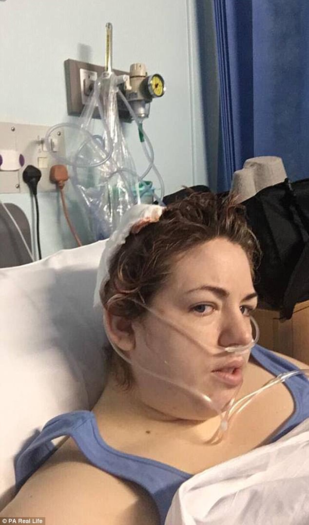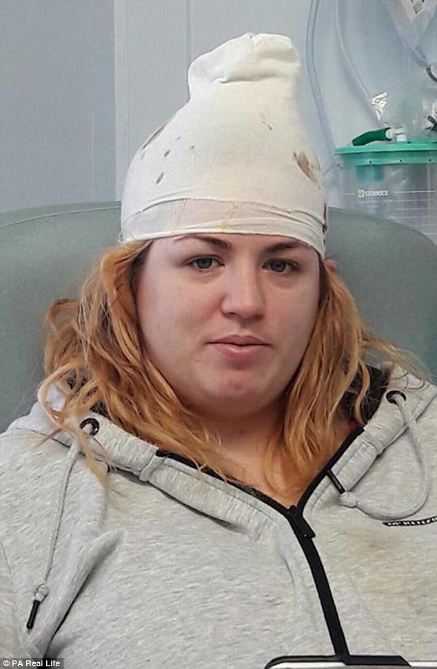 ▼第二天早上,她發現自己半張臉變腫,頭皮也灼傷了。Kirsty再也不敢拖延,跑到醫院求助。剛開始醫生還以為是過敏,沒想到輕輕拉一下她的頭髮,她的頭皮就跟著脫落了。