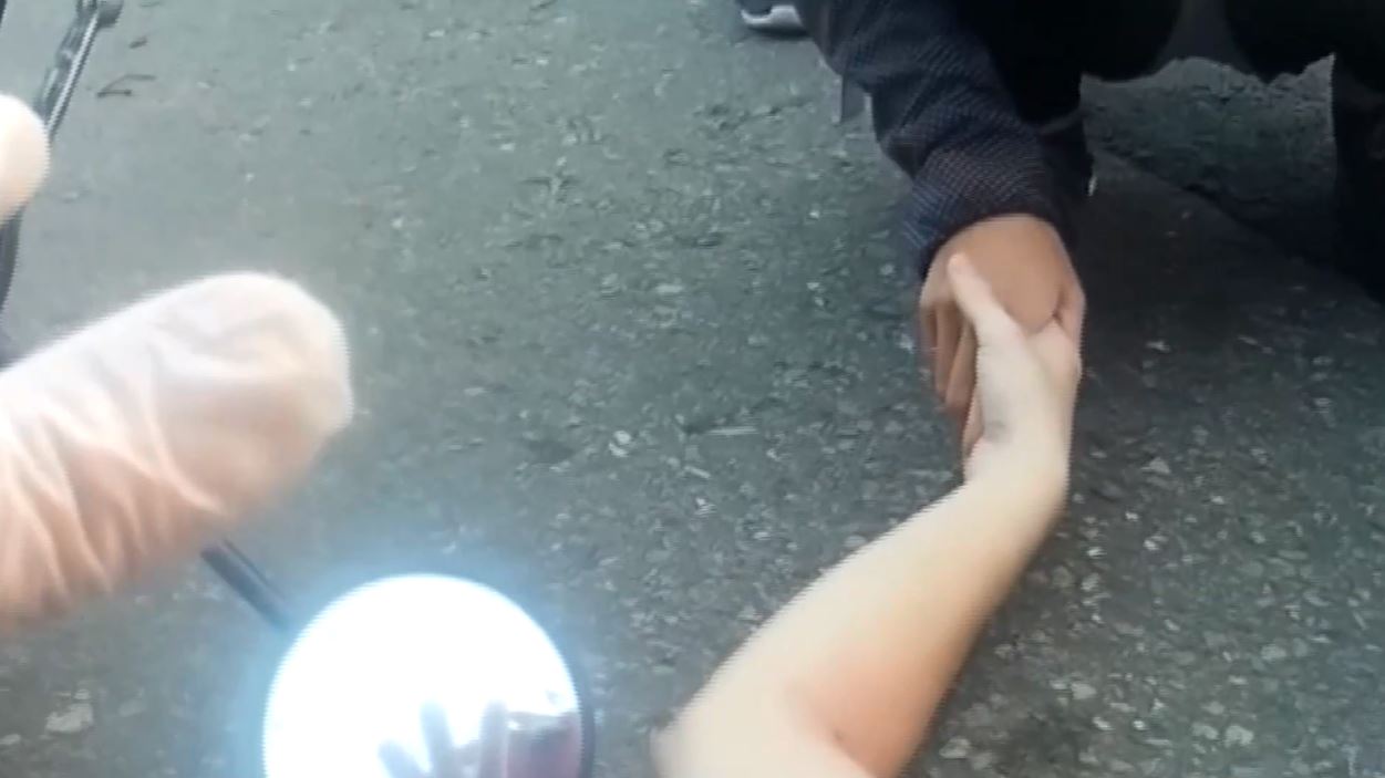 ▼事發當時,遭到小客車擦撞的李姓騎士倒臥在路旁,因為傷勢不斷哀嚎,等到警消抵達後,看見旁邊一位年輕女子則握著他的手,不斷加油打氣,陪他等待救援,還以為兩人是情侶,但事後女子不願跟著上救護車,才驚訝得知她是好心經過的路人。