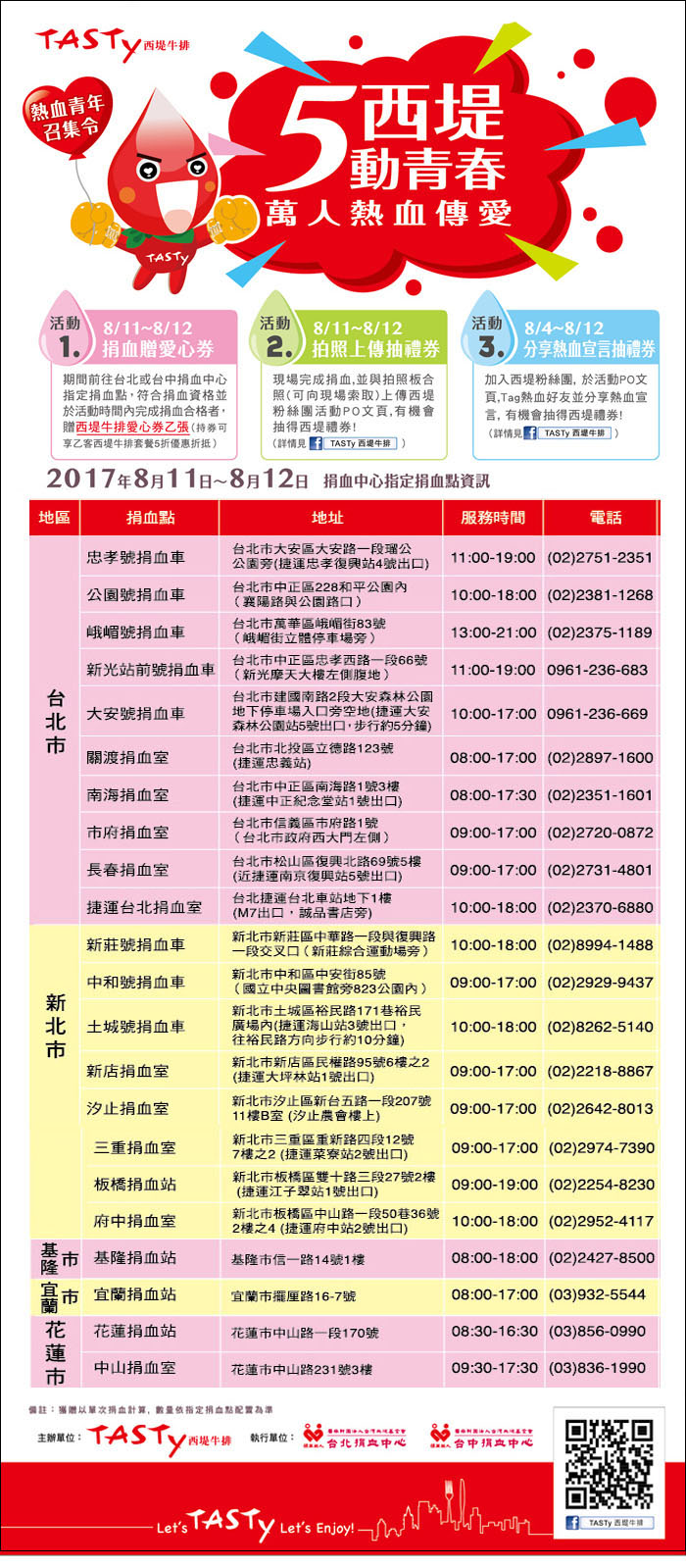 2017年08月11日台灣血庫的存量告急,包括A型、B型、O型血都在嚴重不足的狀況,捐血中心為了鼓勵民眾捐血,特別跟連鎖餐廳西提合作,推出只要捐血就送折價券的獎勵!