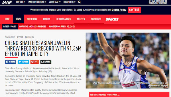 ▼不過國際田徑總會(IAAF)已經在官網認可,表示鄭兆村的確破了亞洲擲標槍的紀錄,中華田總的副秘書長鄭世忠也駁斥造假一說,「器械完全合乎標準!現代標槍規格已10幾年未更改,根本沒有新舊的問題。」