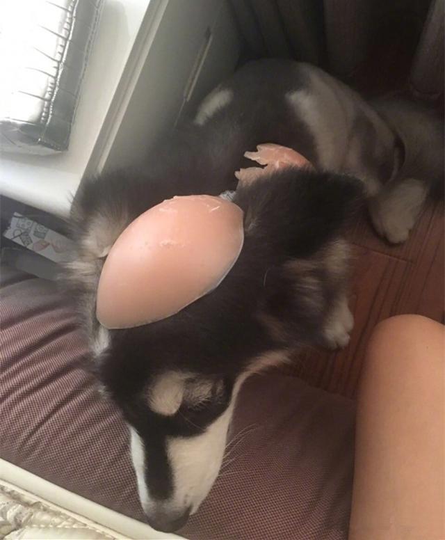▼她嚇了一跳,立刻跳起來查看狗狗的禿頭,這才發現不對勁,原來調皮的毛小孩頭上頂著她的NuBra!