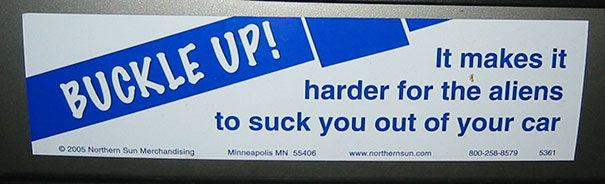 ▼「請繫好安全帶,這樣外星人比較難把你從車子裡吸走。」