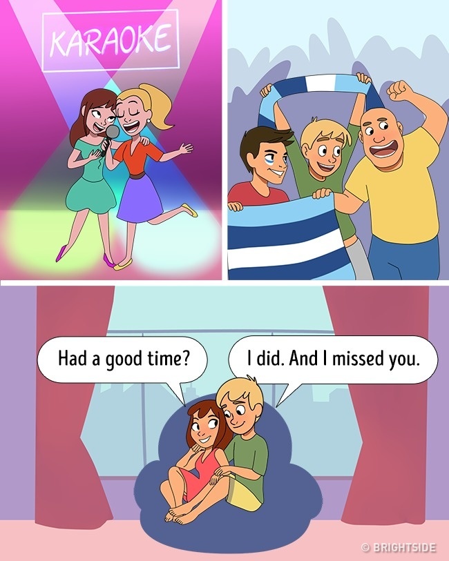 我們都有不同的人格、興趣和朋友圈。如果你的伴侶愛好釣魚與大自然,而你喜歡打保齡球和熱鬧聚會,不要因為他沒邀你去湖邊就往心裡去,他肯定還記得你上次覺得很無聊。
