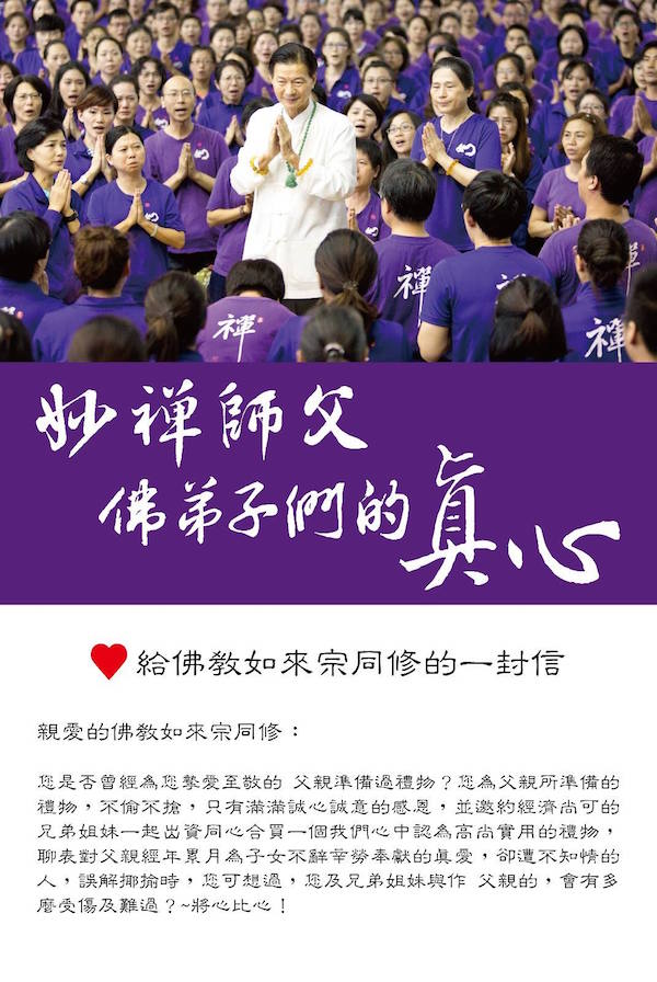 ▼妙禪信徒以「給佛教如來宗同修的一封信」為題,表示:「您是否曾經為您摯愛至敬的父親準備過禮物?您為父親所準備的禮物,不偷不搶,只有滿滿誠心誠意的感恩,並邀約經濟尚可的兄弟姐妹一起出資同心合買一個我們心中認為高尚實用的禮物,聊表對父親經年累月為子女不辭辛勞奉獻的真愛,卻遭不知情的人,誤解揶揄時,您可想過,您及兄弟姐妹與作父親的,會有多麼受傷及難過?將心比心!」