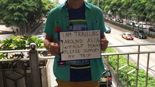 ▼這是近幾年在東南亞地區常見到的怪象,許多歐美白人會站在路邊,舉著「我在亞洲旅遊,但沒有旅費,請資助我的旅行」的牌子乞討,靠著好心人的施捨,來無償換取自己的旅費。