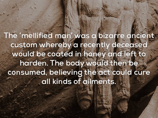 ▼10. 「蜜漬人」是一種古老的詭異習俗,剛死去的人會被浸泡在蜂蜜裡逐漸硬化,然後屍體再被食用,據說這樣能治百病。