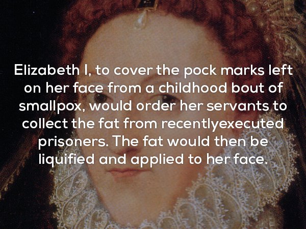 ▼9. 英國女皇伊麗莎白一世為了遮掩小時候天花留在臉上的一個痘疤,她會要求隨從從剛處死的死刑犯身上取出脂肪,液化處理後再塗抹在臉上。