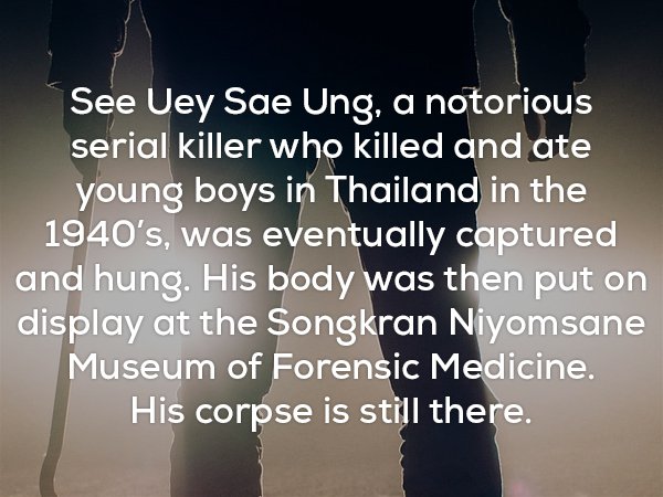 ▼5. 細偉(Uey Sae Ung)是1940年代惡名昭彰的泰國殺人魔,他連續殺害多名男童,並取心挖腦烹食,被捕後處以絞刑。他的遺骸至今仍保留在泰國的屍體博物館展出。