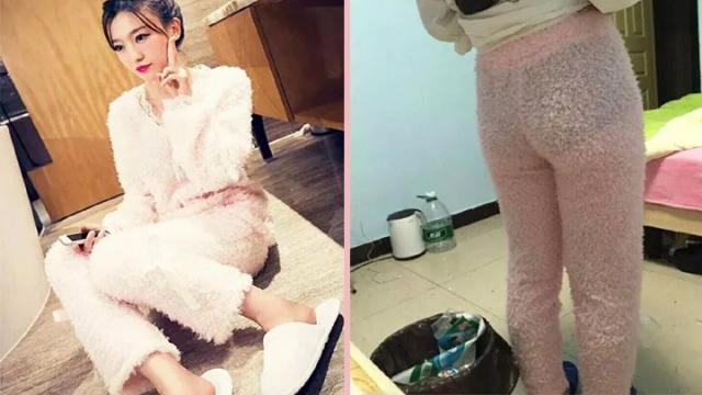 ▼網店模特兒身上毛茸茸的睡衣,看上去溫暖又可愛,但是網友買來穿在身上,就變成超尷尬的模樣,睡褲的質地又薄又透,內褲都隱約可見,根本就是絲襪啊。