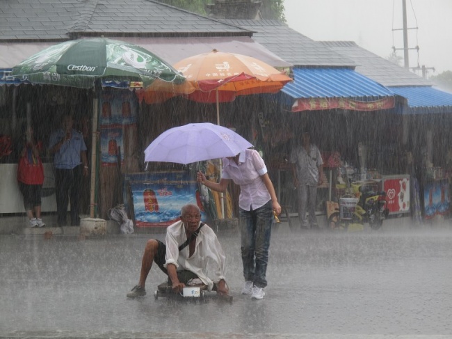 ▼傾盆大雨中一位陌生年輕人為乞討老人撐傘。