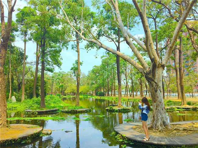 園內綠蔭林立、湖水清澈,陽光滲透樹葉灑在叢林中,猶如世外桃源般讓人心曠神怡,這裡也被網友稱為「城市裡的忘憂森林」,適合一家出遊,朋友相約拍照,逛完公園,還可以去旁邊的大東藝術中心,簡單的灰階線條也是拍照的絕佳背景。