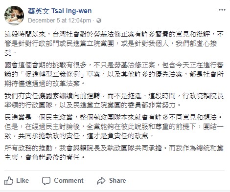 ▼雖然蔡英文總統在臉書表示:「台灣社會對於《勞基法》修正草案有許多寶貴的意見和批評,不管是針對行政部門或民進黨立院黨團,或是針對我個人,我們都虛心接受。」可是仍無法平息民眾和勞方的憤怒。