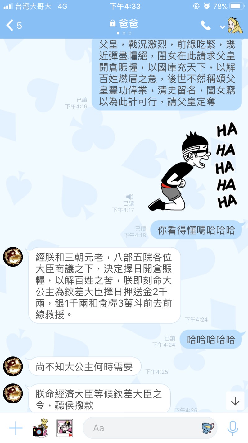 ▼老爸也很霸氣地回應:「准奏。」但她擔心老爸看不懂,又再詢問了一次,沒想到爸爸回:「格格,汝之請奏,似有何處戰事不明之嫌,雖前方吃緊,後方緊吃」,還寫說「吾國糧倉實已空虛」,但因為寶貝女兒處身前方,「吾當竭盡倉底,亦將援軍於汝;不日即將抵達,尚請暫忍待援!」