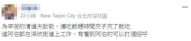 ▼只見伯伯不時凝望遠方,又低頭用夾子吃便當,就這樣吃了10多分鐘。網友事後將照片發上網路,是希望向這些清道夫致敬,也讓更多人看到他們的辛苦。