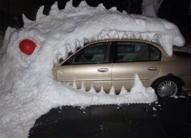 ▼堆雪人也太沒新意,不如堆個鄂魚來吞掉汽車吧!