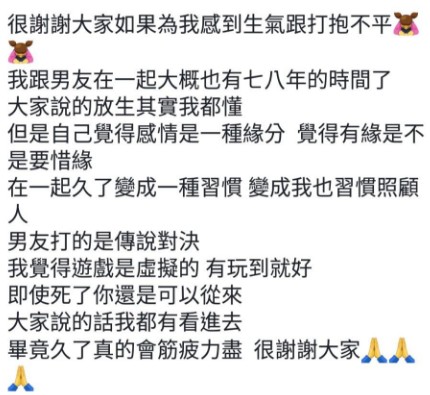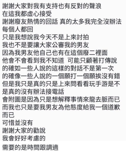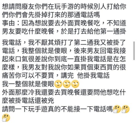 雖然玩遊戲被打擾會超不爽,可是這位男生講話的方式也真的有點過分。希望這名女網友能夠好好思考和協調,看雙方是否真的願意繼續一起走下去!