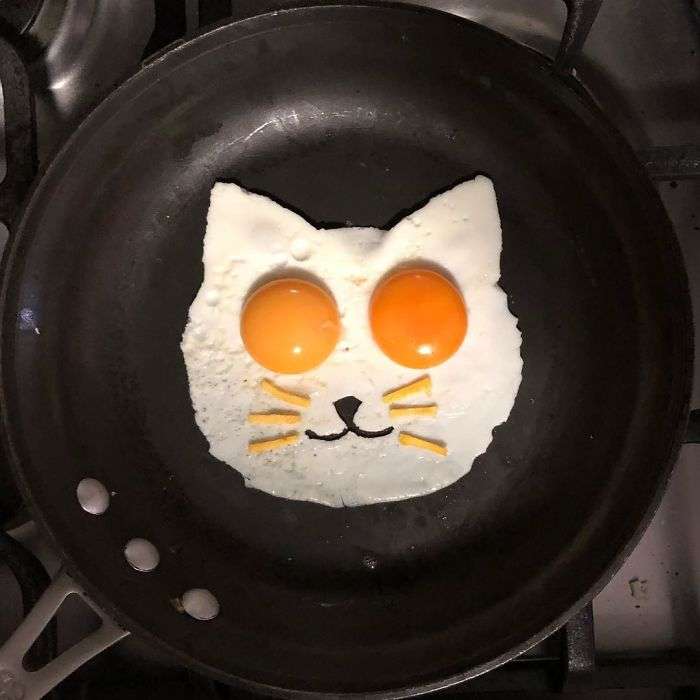 ▼他把平底鍋當成畫布,用雞蛋構建各種各樣的圖案,花朵、貓咪、八卦圖等等,看起來非常有趣。