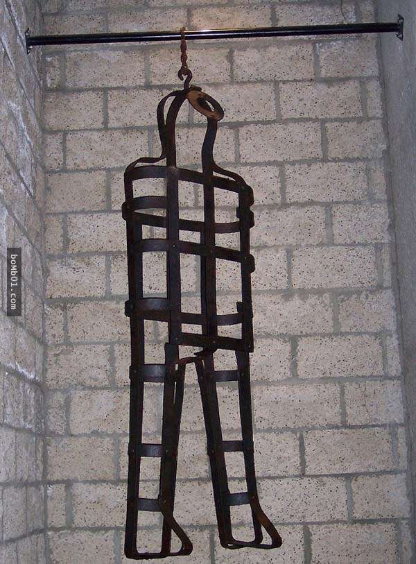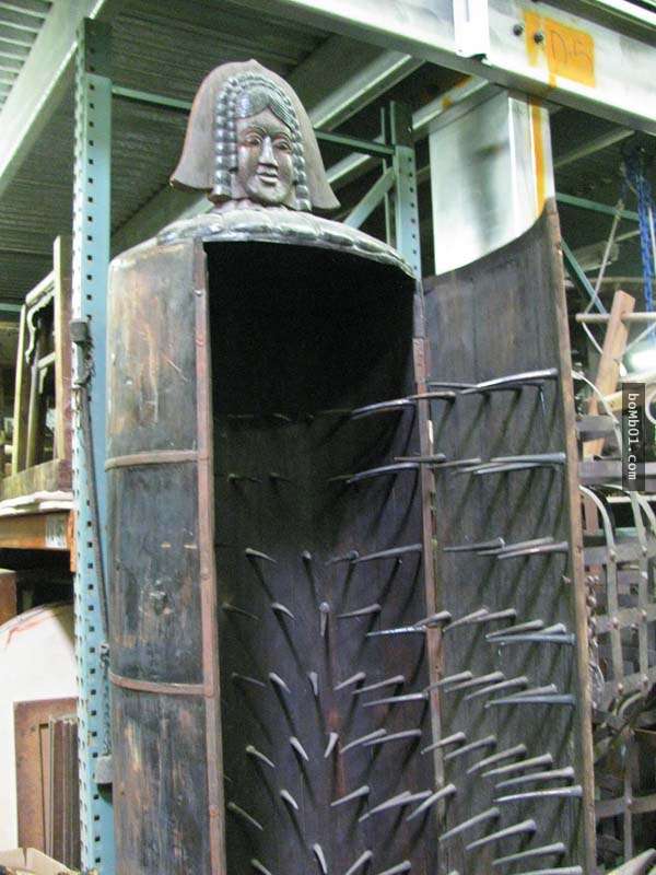 ▼12.鐵娘子:對這種酷刑的合理性有些爭論,但如果是真實的,罪犯會被綁在這個容器裡面,門會被關上。釘子不會穿透任何重要器官,所以他們會過幾小時或幾天才死掉。