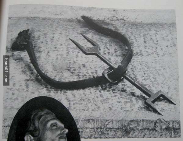 ▼19.異教徒叉:這個裝置是兩端有叉子的金屬杆,一個叉子放在下巴底下,另一個放在胸部上,頸圈支撐著叉子,使罪犯頭部直立,如果不這樣做他們就會感到疼痛。