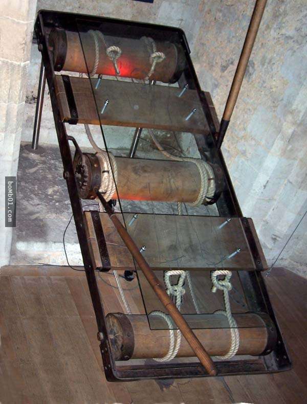 ▼5.拷問台:罪犯被綁在架子上,行刑者轉動手柄,用繩索朝相反方向拉他們的手和腿。最終罪犯的骨頭會脫臼甚至被撕裂。