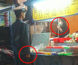▼疑點一是雞排店女老闆單手緊握欄杆,似乎很緊張,有網友猜測:「老闆娘被他的氣勢嚇到了,趕緊抓著欄杆保持鎮定」疑點二是立正姿勢應該要五指伸直併攏,照片中的軍校生手部竟然呈「握拳」狀,相當弔詭。