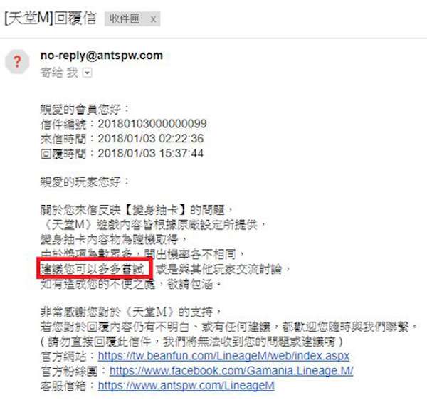 ▼他也寄信給代理的遊戲橘子抗議,不過官方回覆卻是:「變身抽卡內容物為隨機取得,由於獎項為數眾多,開出機率各不相同,建議你可以多多嘗試。」讓他又罵:「客服叫我再多多嘗試,當錢是水啊?砸25萬台幣只能合成一次!你詐欺啊?」