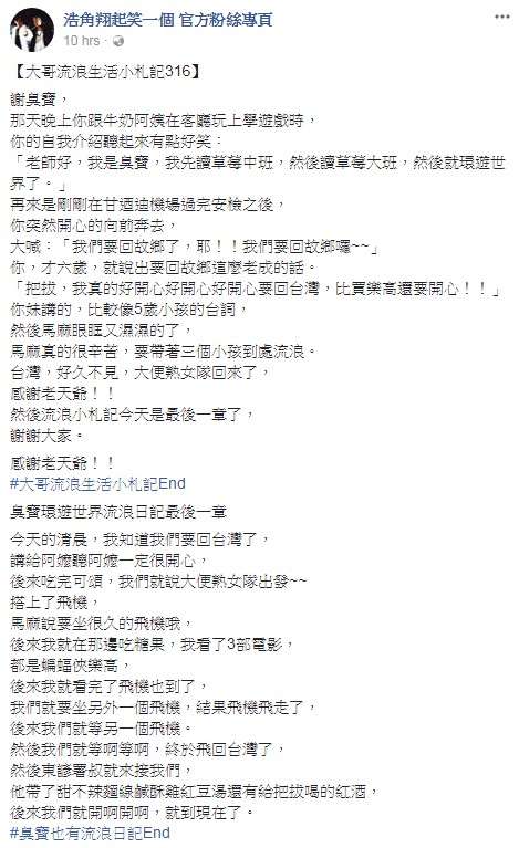 ▼浩子經常在臉書粉絲團「浩角翔起笑一個 官方粉絲專頁」中的「大哥流浪生活小札記」系列與粉絲分享自己旅行時所遇到的趣事和心得,在1月5日凌晨他po出了「最終章」,表示自己已經在美國甘迺迪機場準備飛回台灣了。