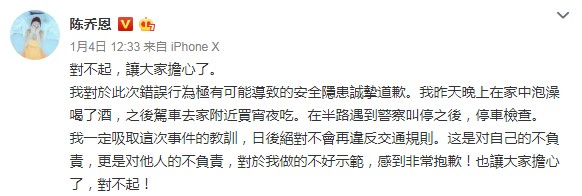 ▼對於這一次的事件,陳喬恩也在微博上po文向大眾道歉,以下是她的微博全文:
