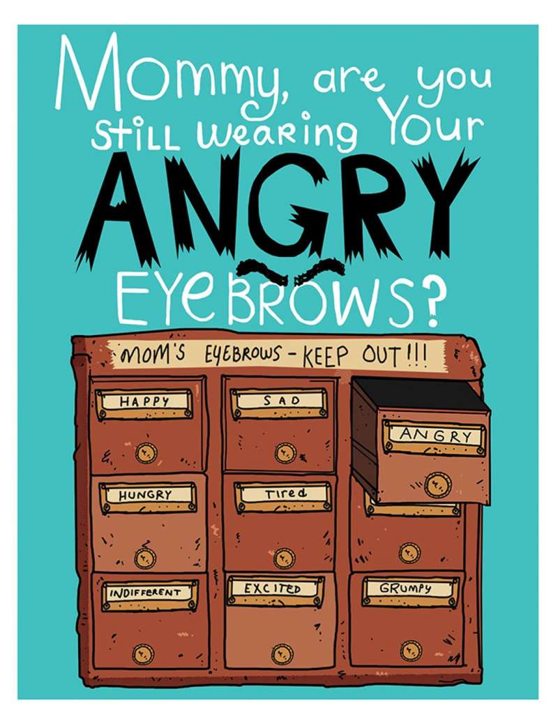 ▼「媽媽,妳還在戴妳的『憤怒眉毛』嗎?」櫃子上是:「媽媽的眉毛,別碰!」裡頭包括了快樂眉毛、傷心眉毛、憤怒眉毛、飢餓眉毛、疲憊眉毛、冷淡眉毛、興奮眉毛、壞脾氣眉毛。