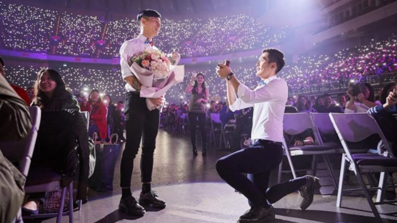 原來這名男子在演唱會前聯絡主辦單位,希望能夠藉此機會向長跑10年的男友求婚。他知道蔡健雅力挺同志,不僅常為同志議題發聲,還曾經號召其他女歌手合唱《We are one》。果然,蔡健雅知道後一口答應,並在演唱會上化身主持人,讓這對有情人有了圓滿的結局。