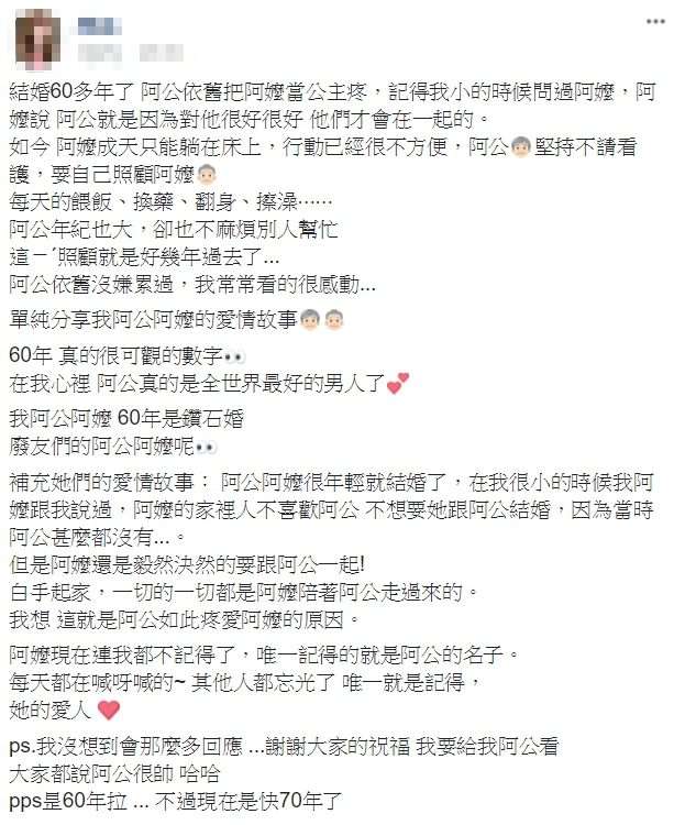 ▼最後,她也說阿嬤現在記憶力不佳,但唯獨記得阿公的名字。儘管阿嬤「連她的名字都忘」,但還是會每天呼喚「愛人的名字」。這段鑽石婚也讓其他人看的感動不已啊!