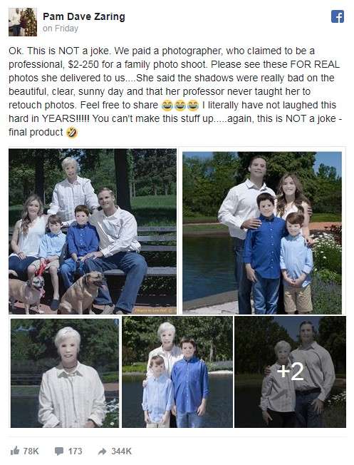 2018年01月14日拍攝全家福找來了「專業攝影師」,收費不便宜要250美元(約新台幣7400元),結果拍出令人啼笑皆非的作品,你會怎麼應對呢?網友 Pam Dave Zaring 近日就在臉書分享了自己被所謂「專業攝影師」所拍出的照片成品,馬上在網路上引起瘋傳!
