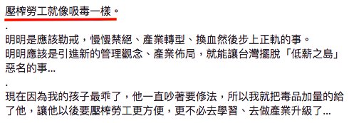 ▼並且,他嚴肅地點出「壓榨勞工就像吸毒一樣」,雇主會越吸越上癮…雇主不需要再去思考「產業升級」,也不需要學習,公司一出問題,用「壓榨員工」來解決最方便。