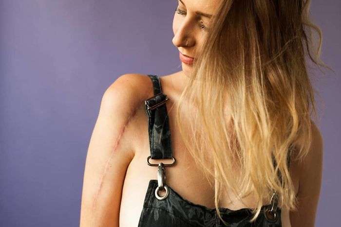 2014年,Barbara被診斷為乳腺血管肉瘤,一種罕見的侵襲性癌症,經過三次手術和兩次化療后,留下了這些傷疤。最近還要接受新的手術,去除胸骨和四根肋骨,她花了很長的時間來適應傷疤,現在她感到很安心,這些傷疤記錄她的生命旅程和從沒想到的勇氣和力量。