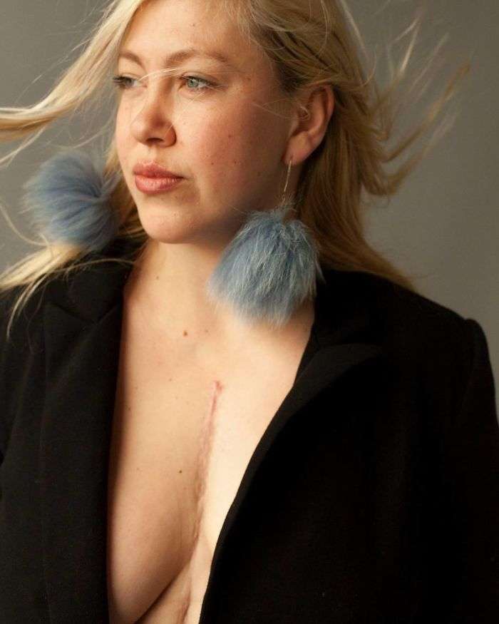 大學畢業後的第一天,Helen被診斷為先天性心臟病,通過心臟修復手術,留下了這個像「拉鏈」一樣的疤痕,她坦然接受發生在自己身上的事,並為疤痕感到自豪。