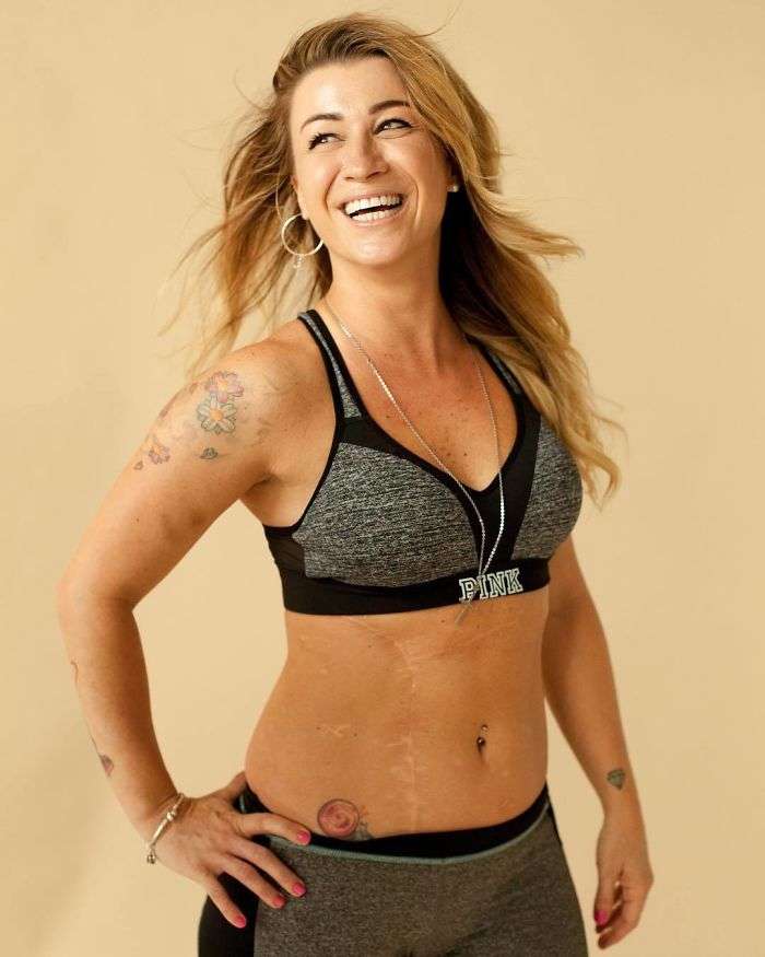 Tracey是一個45歲的母親,2012年因感冒住院,發現患有兩種類型的腦膜炎,後來心臟病發作,不得不進行心臟瓣膜手術和氣管切開術,然後她的身體上就留下了這些疤痕。