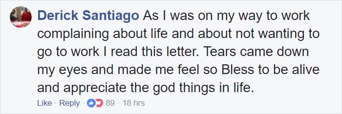 ▼網友們看到後紛紛表示:「我在上班路上,和往常一樣滿腹牢騷,抱怨生活不公平,看到這封信的時候我的眼裡充滿了淚水,現在我覺得活著真的是一件值得感恩的事。」