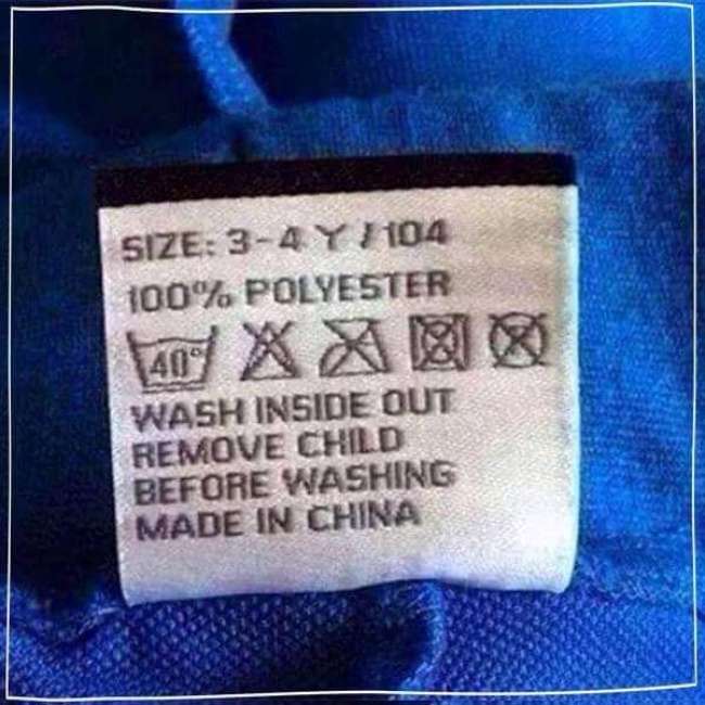 ▼6. 這是一件中國製的小孩睡衣,上面寫著:「反過來洗,洗前先把小孩拿開。」