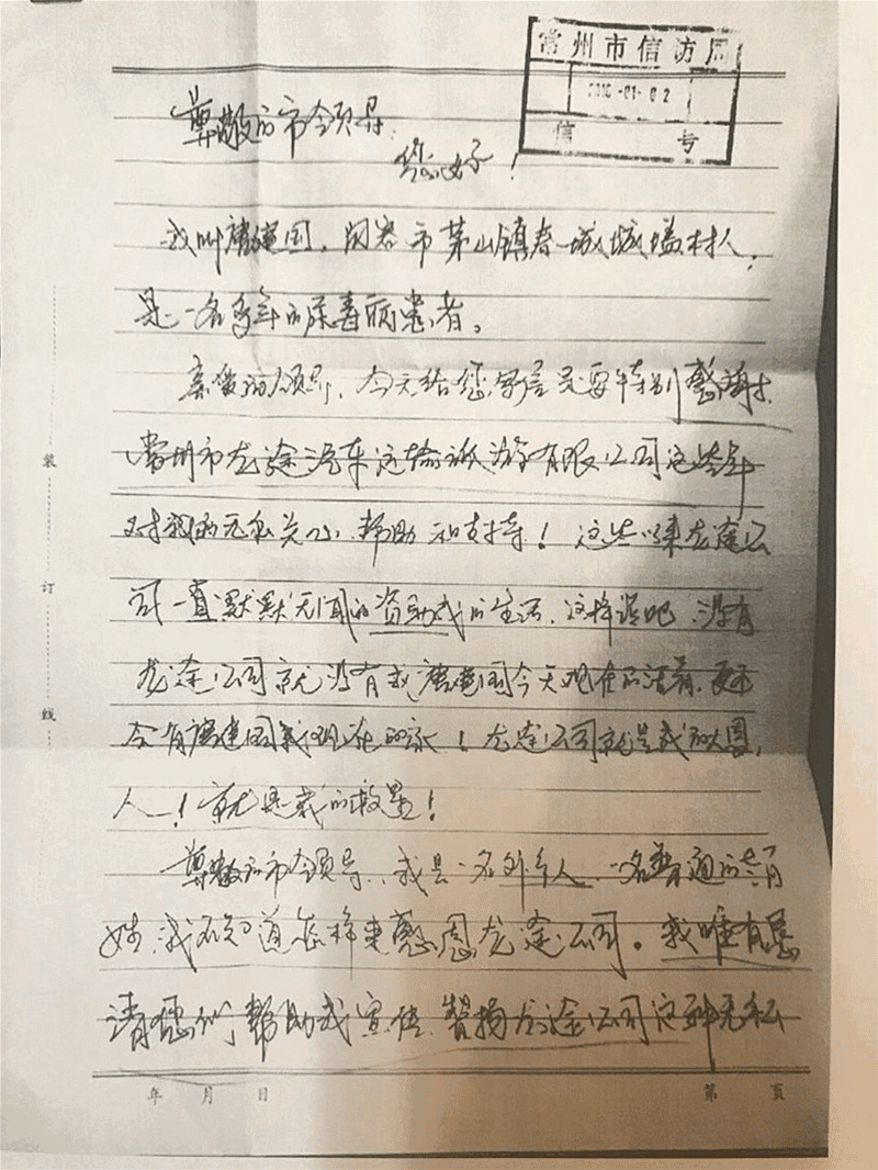 2018年01月24日不久前,中國常州市委市政府收到了一封特別的信。寫信的人是江蘇鎮江49歲男子唐建國。他在信中說:「我是一名尿毒症患者。今天給您寫信,是要特別感謝常州市龍途運輸旅遊有限公司。沒有龍途公司,就沒有我唐建國今天現在的活著,更沒有唐建國我現在的家。龍途公司就是我的大恩人!就是我的救星!」